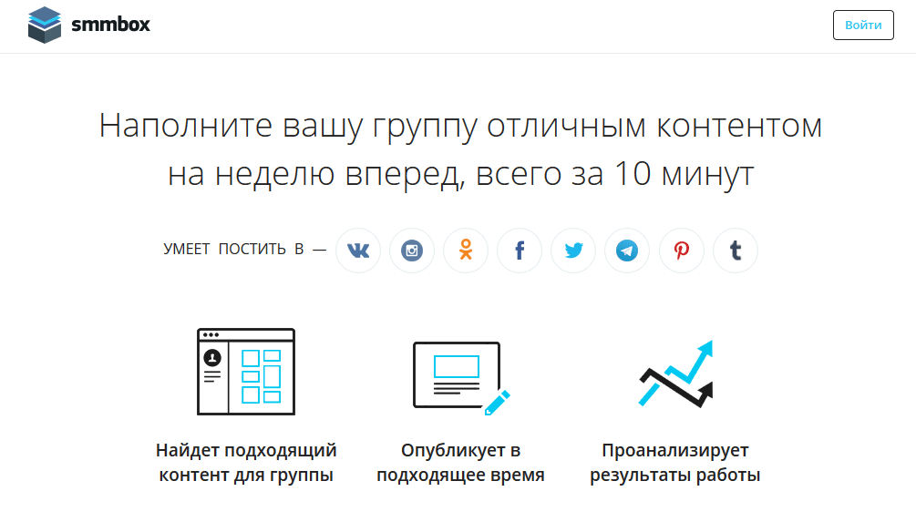 SmmBox – это сервис, который поможет вам наполнить свои группы в социальных сетях, таких как ВКонтакте, Одноклассники, Twitter, Facebook, Telegram, Pinterest, Google+, Tumblr, Instagram, уникальным и интересным контентом, который будет по нраву вашим читателям и подписчикам. Наполнение групп соцсетей в этом сервисе у Вас не отнимет много времени и сил, так как Вы сможете настроить отложенный автопостинг контента в свои группы и выбрать интересующую тематику для вашей отдельно взятой группы.