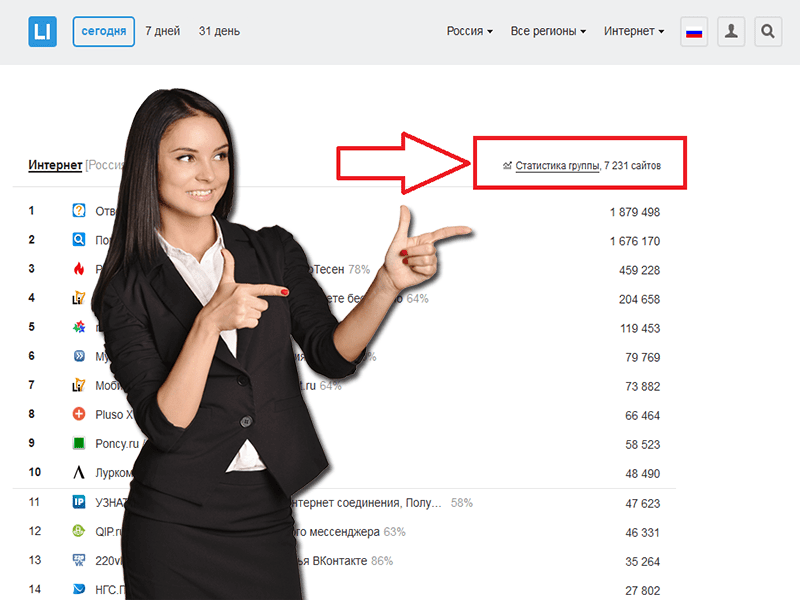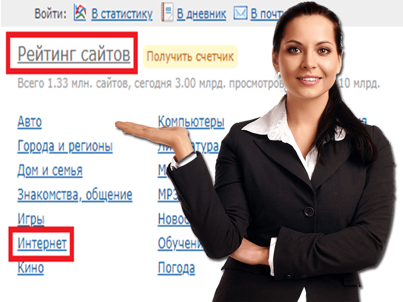 Затем Вам будет нужно отыскать в открывшемся окне сайта найти “Рейтинг сайтов” и далее выбрать интересующую Вас рубрику, возьмем например “Интернет”. Смотрите картинку ниже: