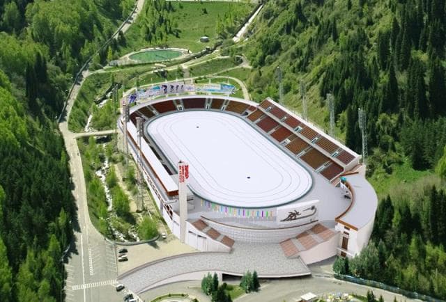 А вот среди лесистых и крутых склонов гор Казахстана в Алматы расположился, наверное самый лучший среди подобных – спортивный комплекс Медеу:
