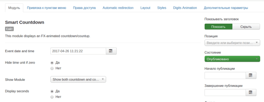 Скачайте расширение, а затем перейдите на страницу “Расширения”/”Менеджер расширений”/”Установить”, чтобы установить его на вкладке “Загрузить файл пакета”. Теперь откройте раздел с перечнем модулей (“Расширения”/”Менеджер модулей”) и кликните на Smart Countdown, чтобы открылась страница настроек: