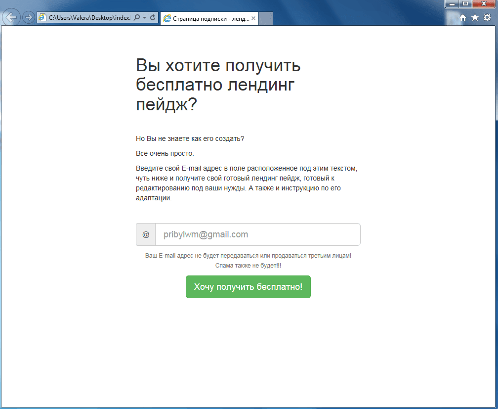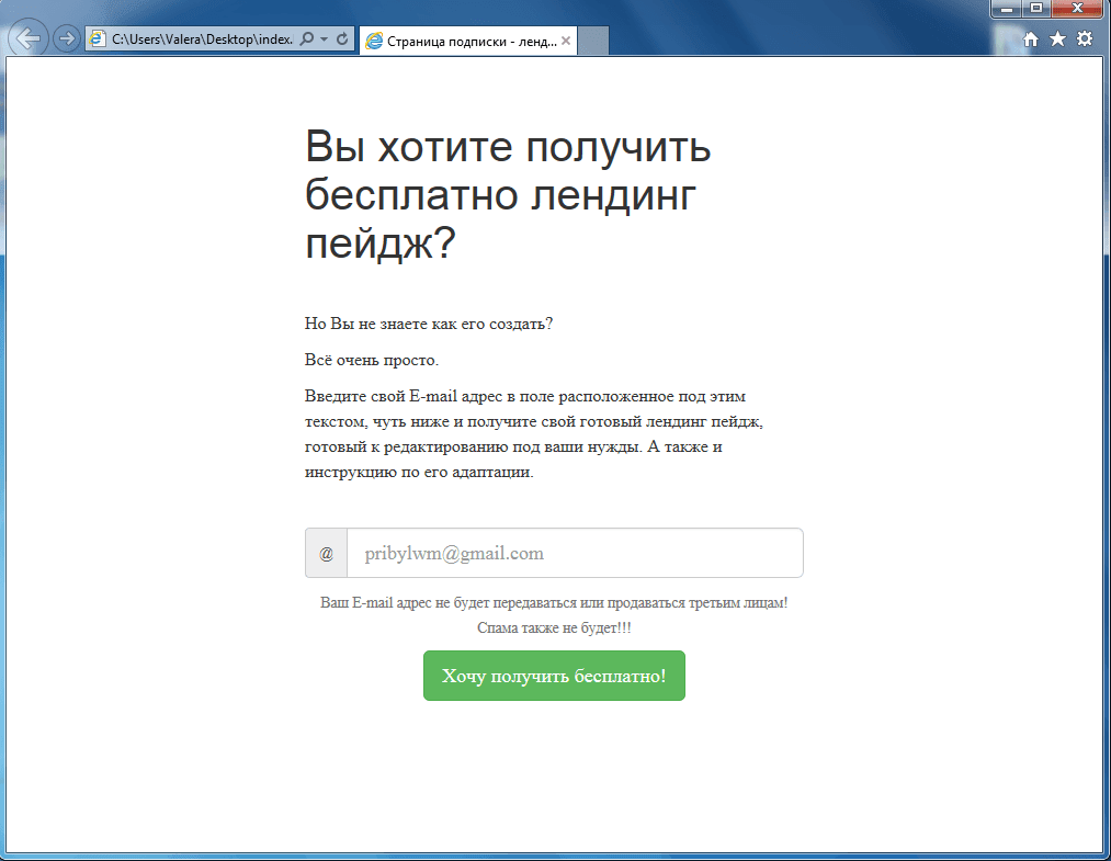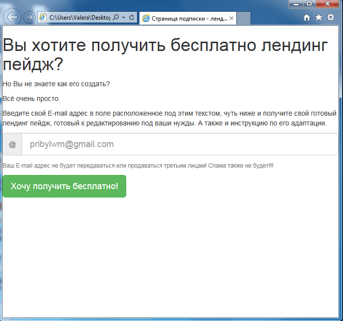 <!DOCTYPE html> <html> <head> <title>Страница подписки - лендинг пейдж</title> <meta charset="utf-8" /> <meta name="viewport" content="width=device-width, initial-scale=1.0" /> <!-- Bootstrap --> <link href="https://yandex.st/bootstrap/3.3.6/css/bootstrap.min.css" rel="stylesheet" /> </head> <body> <h1>Вы хотите получить бесплатно лендинг пейдж?</h1> <p> Но Вы не знаете как его создать? </p> <p> Всё очень просто. </p> <p> Введите свой E-mail адрес в поле расположенное под этим текстом, чуть ниже и получите свой готовый лендинг пейдж, готовый к редактированию под ваши нужды. А также и инструкцию по его адаптации. </p> <form action="/mailing-list" method="post"> <p class="input-group"> <span class="input-group-addon">@</span> <input type="text" class="form-control input-lg" name="email" placeholder="pribylwm@gmail.com" /> </p> <p class="help-block"><small>Ваш E-mail адрес не будет передаваться или продаваться третьим лицам! Спама также не будет!!!</small></p> <p> <button type="submit" class="btn btn-success btn-lg">Хочу получить бесплатно!</button> </p> </span> </form> </body> </html>