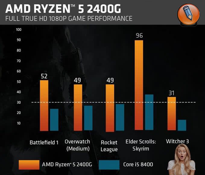 Вот игровое сравнение AMD Ryzen 5 2400G с процессором Intel Core i5-8400, который поставляется со встроенной встроенной графикой Intel UHD Graphics 630 . Ниже Вы можете ясно видеть, что Ryzen 5 2400G с графикой RX Vega 11 превосходит Core i5 8400 с графикой Intel UHD Graphics 630.