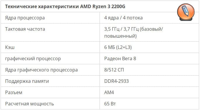 AMD Ryzen 3 2200G — это бюджетный APU, который хорошо подходит для сборки более дешевого игрового ПК по сравнению с вышеупомянутым APU Ryzen 5 2400G. Ryzen 3 2200G также представляет собой 14-нм четырехъядерный процессор, но с 4 потоками и 6 МБ кэш-памяти. Он имеет базовую/повышенную тактовую частоту 3,5/3,7 ГГц, что лишь немного меньше, чем у Ryzen 5 2400G. Производительность этого процессора можно сравнить с процессором Intel Core i5 начального уровня или топовым процессором Core i3 Kaby Lake. Это разблокированный процессор, который можно разогнать на поддерживаемой материнской плате AM4.