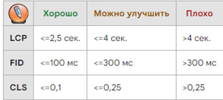 Ниже представлена таблица с конкретными значениями для веб-сайтов, которые хорошо работают, нуждаются в улучшении, и веб-сайтов низкого качества.