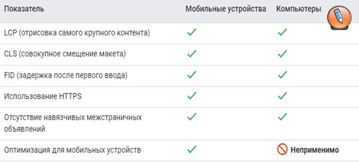 В случае CWV для компьютеров фактор «мобильности», то есть адаптация веб-сайта для мобильных устройств, не будет приниматься во внимание. Это наглядно представлено в таблице ниже: