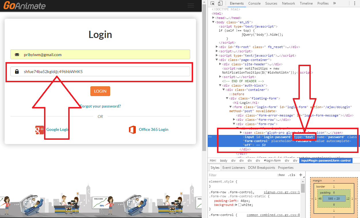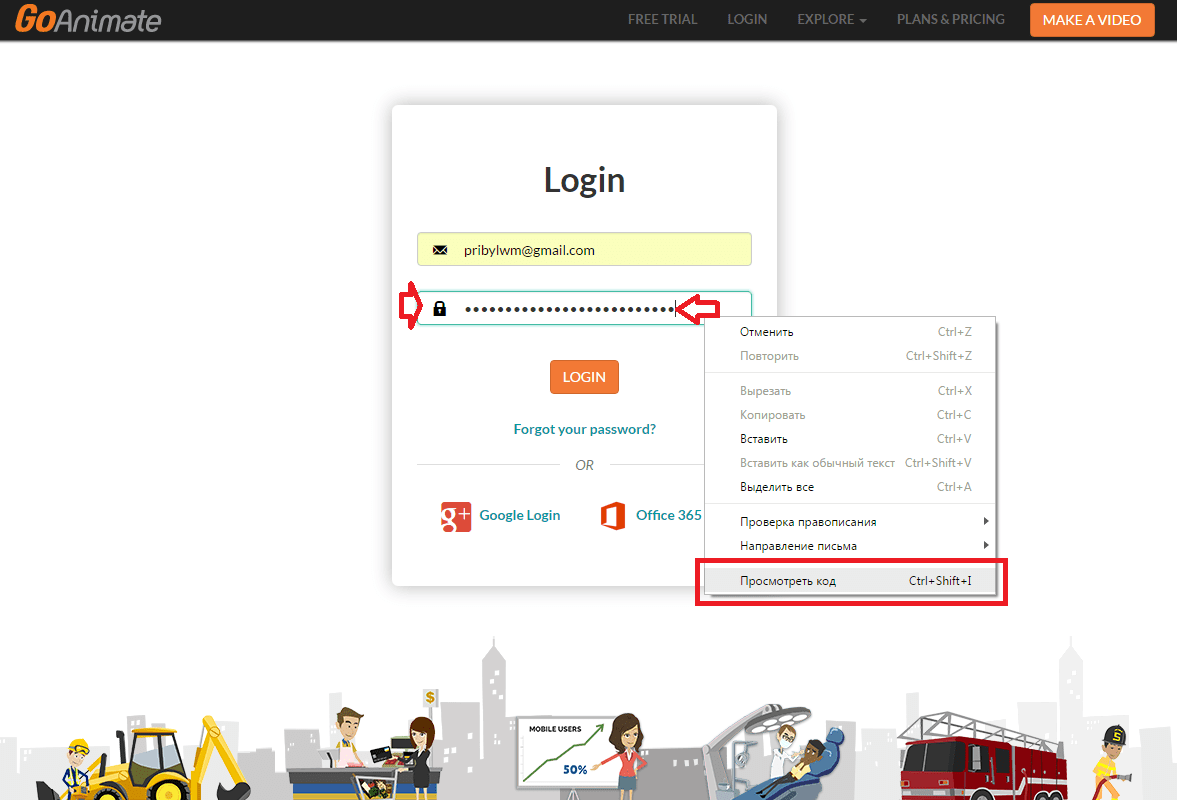 - Второе: Затем откроется окошко справа от Вас, в котором Вы должны навести курсор своей мыши на выделенный синим код и нажать на правую кнопку мыши, чтобы вызвать открытие еще одного окна. В котором Вы найдете вкладку “Edit as HTML” и нажмете на нее уже левой кнопкой мыши. Это нужно для того, чтобы Вы смогли отредактировать код выделенный синим. После этих действий Вы должны изменить слово “password” в указанном на картинке словосочетании (type=”password”), на слово “text“. То есть у Вас должно получиться вот так (type=”text”). Смотрим картинку и делаем: