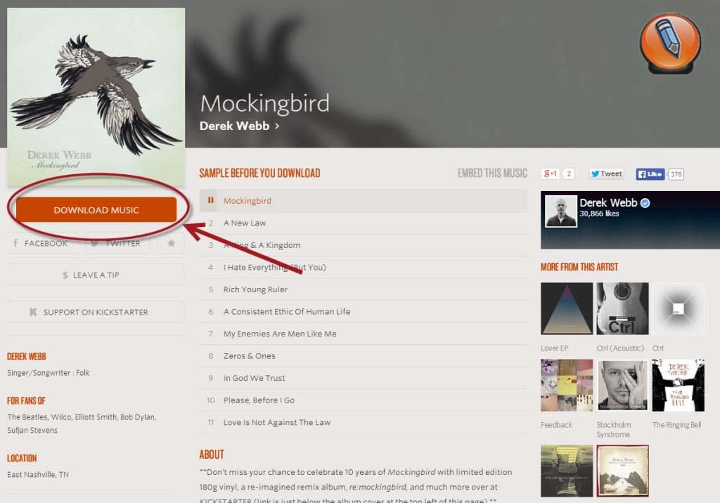 С noisetrade.com Вы можете найти множество музыкальных композиций и скачать их без проблем. Интерфейс довольно стильный, что делает навигацию по сайту приятной. Вы найдете новые, новейшие и популярные графики на выбор. К сожалению, noisetrade.com не показывает качество дорожки, но позволяет прослушать песню перед ее загрузкой. Таким образом, более или менее Вы сможете решить, хотите ли Вы скачать трек или нет. Кроме того, каждый альбом содержит краткое описание и информацию о похожих исполнителях для проверки. Чтобы скачать трек, Вам необходимо войти в свою учетную запись Facebook. После этого нажмите оранжевую кнопку «Скачать музыку» и сохраните трек на вашем компьютере.