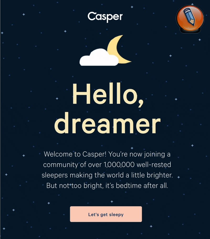 Вдохновляйтесь этим приветственным письмом от Casper mattresses. Текст электронного письма дружелюбен и успокаивает (например, «Привет, мечтатель», «Давай поспим» и т. д.), Но в то же время отражает их ценности («Теперь Вы присоединяетесь к сообществу, состоящему из более чем 1 000 000 хорошо отдохнувших спящих»). Это с самого начала задает эмоциональный тон их почтовому брендингу.