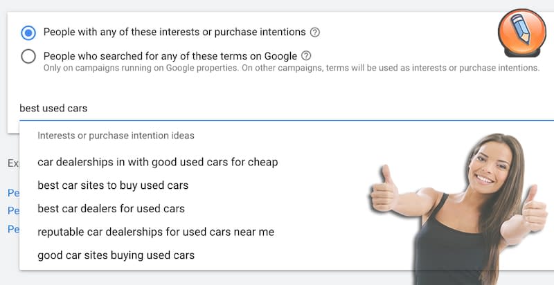 Например, если Вы пытаетесь настроить таргетинг на пользователей, которые хотят купить подержанный автомобиль, Вы можете ввести что-то вроде «лучшие подержанные автомобили», тогда Google покажет вам другие фразы, на которые Вы можете настроить таргетинг, на основе того, что они видели. пользователи ищут. По мере добавления дополнительных ключевых слов Вы увидите, что диаграмма Audience Insights справа настроена в зависимости от аудитории, которую Вы выбрали для включения.
