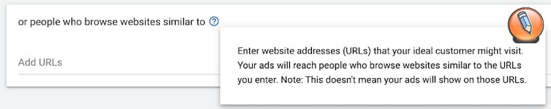 В этом разделе Google просит Вас указать типы веб-сайтов в форме URL, которые будет посещать Ваша целевая аудитория. Как уже упоминалось, это не способ нацеливания на эти конкретные места размещения на веб-сайтах, а, скорее, использование информации об аудитории с этих сайтов для поиска новых пользователей.