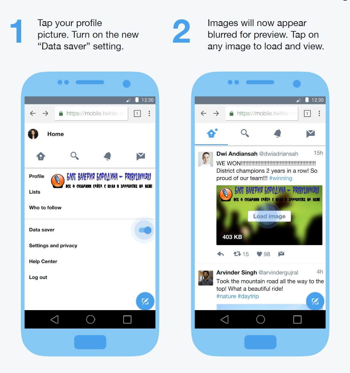 Кроме того, мы добавили режим сохранения данных, который еще больше уменьшает объем используемых мобильных данных. В этом режиме Вы увидите предварительный просмотр изображений и видео, прежде чем выбрать, какие из них следует загрузить полностью. Это может сократить использование ваших данных на 70%, делая более доступным использование Twitter в тех областях, где мобильные данные дороги.