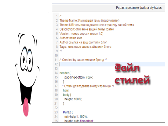 /* Theme Name: Имя вашей темы (придумайте!) Theme URI: ссылка на домашнюю страницу вашей темы Description: описание вашей темы кратко Version: номер версии темы (1.0) Author: ваше имя Author: ссылка на ваш сайт или блог Tags: ключевые слова сайта или блога */ /* Created by ваше имя или бренд */
