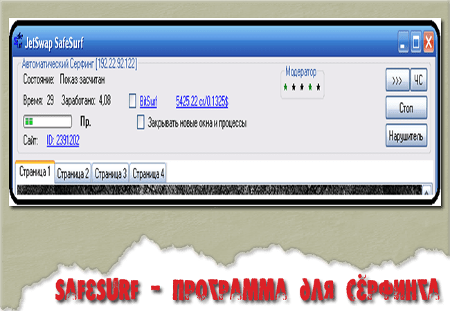Вот так будет выглядеть SafeSurf программа для сёрфинга запущенная на вашем компьютере. И она практически в автоматическом режиме будет серфить сайты рекламодателей и зарабатывать для Вас деньги. Затем эти заработанные путем автосерфинга деньги Вы сможете спокойно вывести себе на кошелек WebMoney или использовать их для продвижения и раскрутки своего сайта или сайтов.