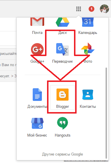 - Далее в свой gmail аккаунт, если его нет, то заведите, это займет у Вас совсем немного времени и знаний для этого много не понадобится. заведите там себе почтовый ящик и в верхнем правом углу найдите кнопочку “blogger“, жмем и создаем свой новый блог: