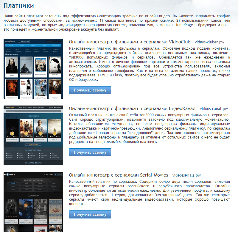 Платники – это специальные сайты, которые определенным образом осуществляют монетизацию вашего кинотрафика и конвертируют его в живые деньги! Они заточены под эффективную монетизацию трафика для онлайн-видео и Вы сможете перенаправлять свой трафик любым для Вас удобным способом.