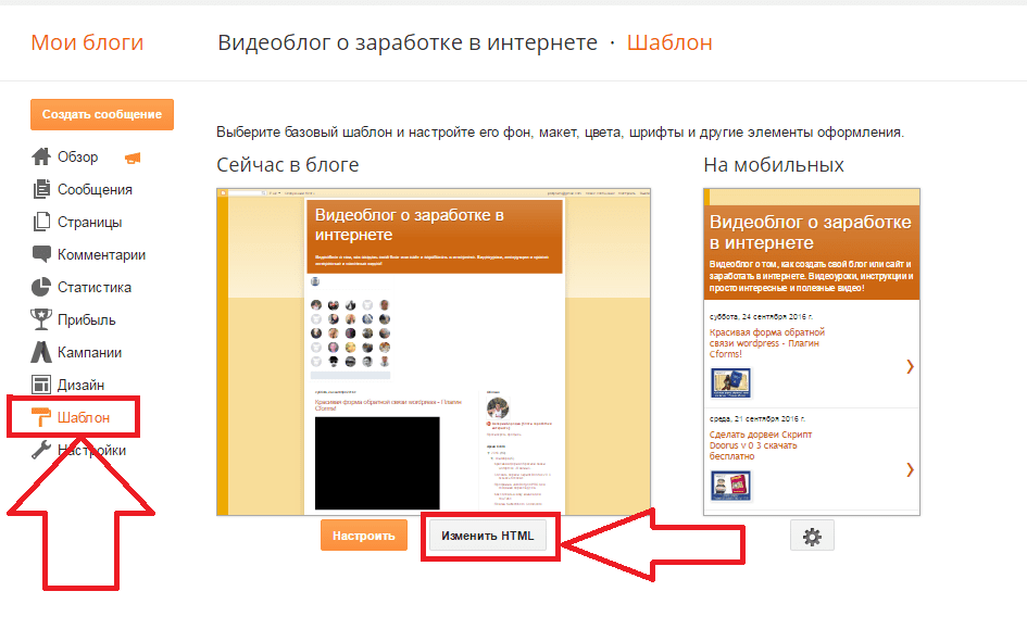 Теперь в новом блоге вам нужно зайти в настройки и далее в шаблон, тут нажмите изменить HTML: