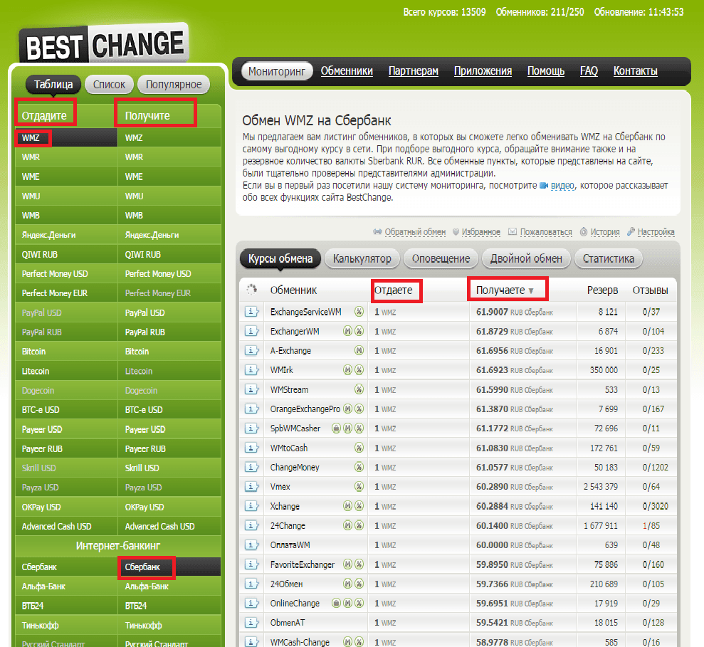 Мониторинг обменников BestChange постоянно ведет мониторинг наиболее надежных обменников электронных денег в Интернете, благодаря этому клиенты BestChange всегда получают возможность найти самый выгодный обмен WebMoney, обмен Яндекс Деньги, обмен RBK Money, MoneyMail, обмен OKPay, обмен Perfect Money, обмен PayPal, Skrill, SolidTrustPay, обмен Payza, EgoPay, обмен Z-Payment, BitCoin, LiteCoin, обмен EasyPay, Pecunix, обмен Visa QIWI Wallet (Киви кошелек) ввод, вывод используя банковские счета Альфа-Банк, Сбербанк, Тинькофф, ВТБ24, а также системы мгновенных денежных переводов Western Union, MoneyGram и многие другие.