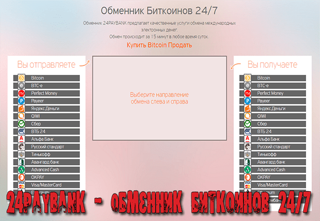 Можете почитать о данном сервисе обмена международных валют отзывы в интернете и Вы там найдете только положительное! 24paybank – это круглосуточный обменный сервис онлайн, который поддерживает платёжные системы – Bitcoin, Perfect money, BTC-e, Qiwi RUR, Yandex money, Payeer, Advanced Cash, OKPAY, Ethereum. И также Российские Банки – Visa/MasterCard RUB, Сбербанк, Альфа банк, Тинькофф, Русский Стандарт, ВТБ24, Авангард.