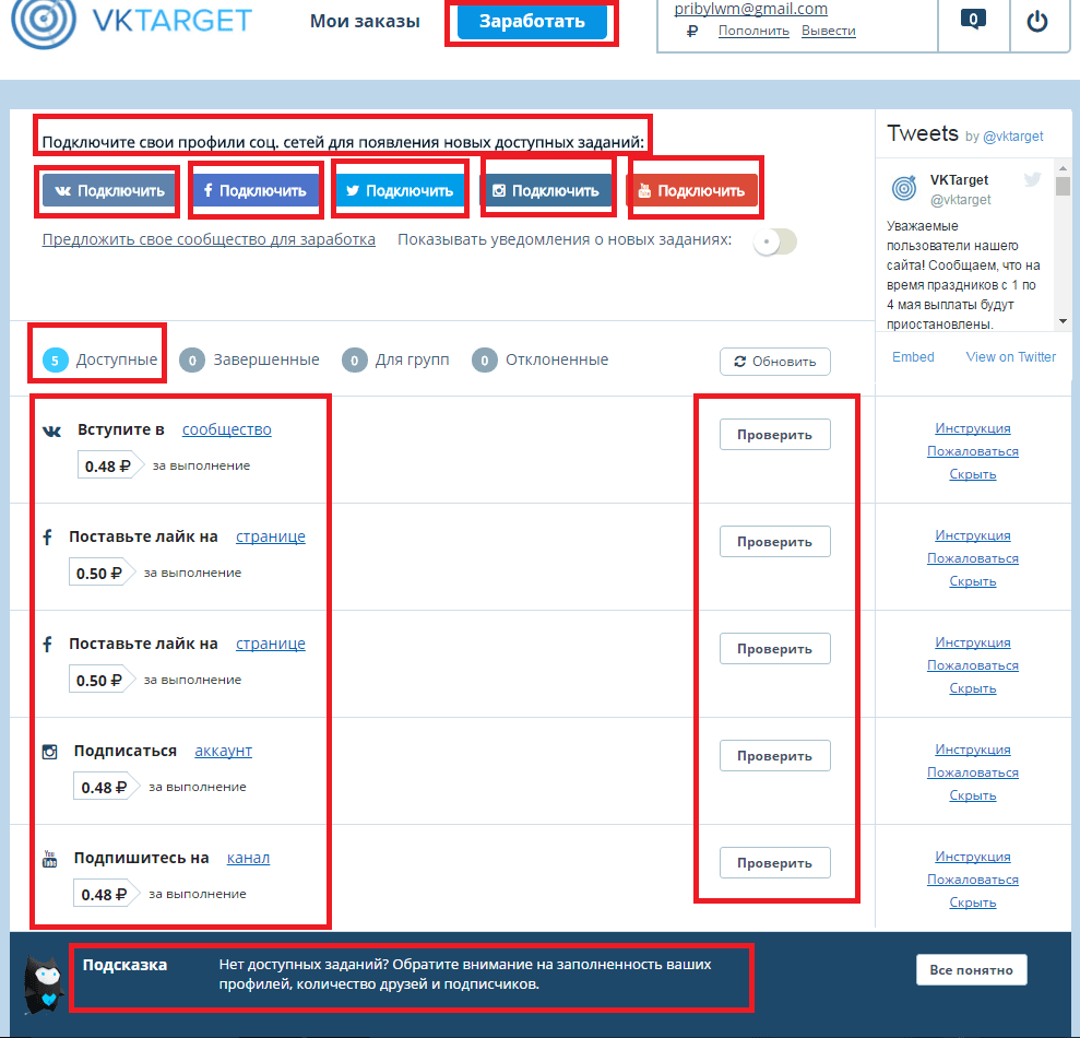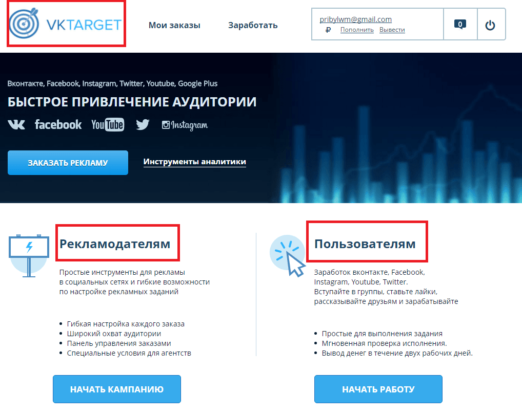VKTarget – замечательный сервис. С его помощью зарегистрированный пользователь может заработать во ВКонтакте, а если Вы заказчик, то можете накрутить лайки, перепосты, подписчиков, друзей: ВКонтакте, Facebook, Instagram, Twitter, Youtube, Google+. Здесь также есть для Вас возможность рекламировать свои посты в других тематических группах и заработать, рекламируя их в своей группе.