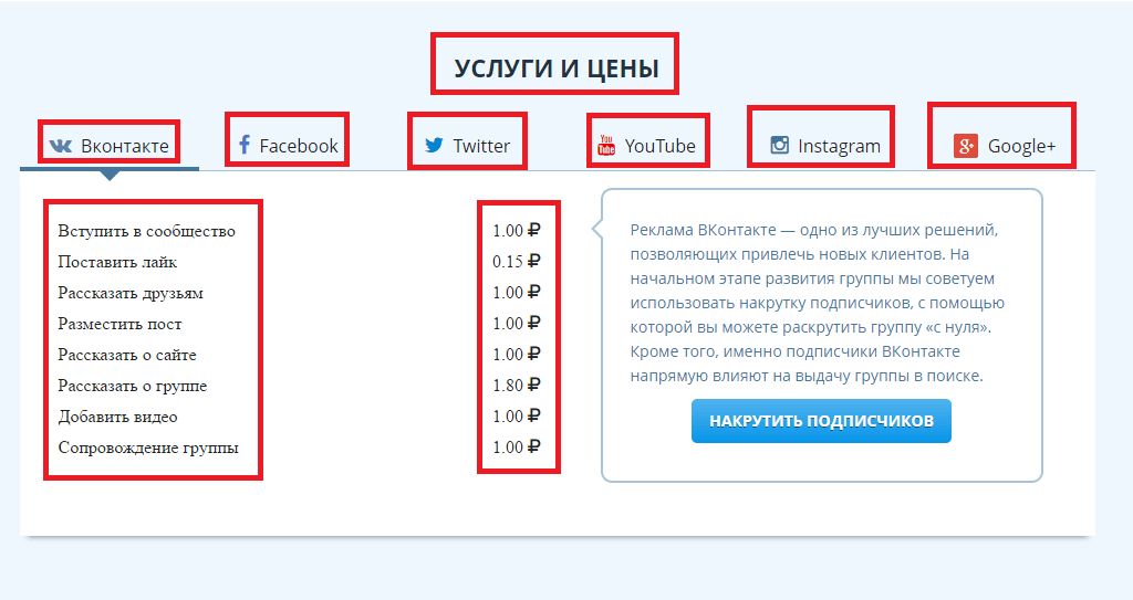 Второй скриншот – Услуги и цены, где Вы сможете видеть в каких социальных сетях можно заработать и сколько все это будет вам стоить. А социальные сети разнообразны: ВКонтакте, Facebook, Instagram, Twitter, Youtube, Google+. Одни из самых популярных и высоко посещаемых:
