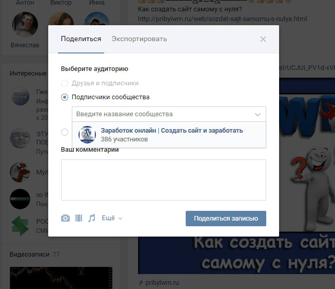И рядом с этим значком будет надпись “Поделиться”. Нажмите на нее и у Вас выскочит вот такое окошко, где Вы сможете поделиться своим постом со своими друзьями и т. д. Написать им сообщение, прикрепить к вашему сообщению картинку или видео, а может Вы захотите прикрепить музыку или еще что-то, пожалуйста делайте это: