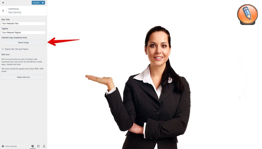 Каждая тема WordPress может иметь несколько различных настроек, и это нормально. На данный момент нас интересует только вкладка «Идентификация сайта». Как только Вы нажмете на него, Вы увидите несколько различных настроек сайта, включая логотип Вашего сайта и область для загрузки или повторной загрузки нового.