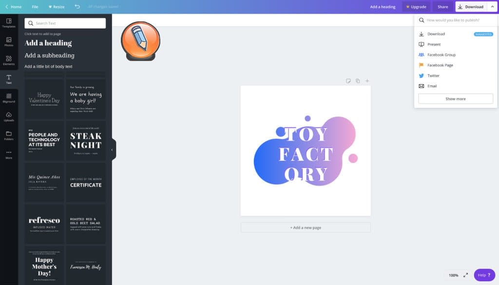 Когда Вы будете готовы к экспорту, Вы можете сделать это с помощью кнопки «Загрузить» в правом верхнем углу экрана. Выберите тип файла, и все готово.