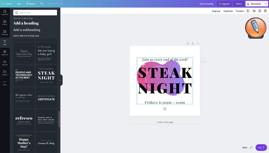 Если Ваш логотип требует текста, перейдите на вкладку Текст. На этой вкладке Вы найдете различные текстовые композиции. Это весело, потому что они позволяют Вам просматривать и играть с различными комбинациями шрифтов и иерархий. Если у Вас есть хорошее представление о Вашей текстовой композиции, просто добавьте заголовок в артборд и получите стилизацию.