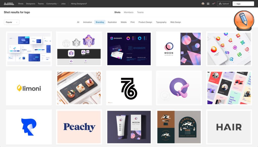Наконец, Вы можете просматривать веб-сайты, такие как Dribbble, которые также имеют большой выбор дизайнов и множество прекрасных примеров дизайна логотипов.