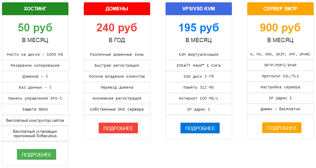 А вот тарифные планы, которые Вы сможете выбрать для своих сайтов: