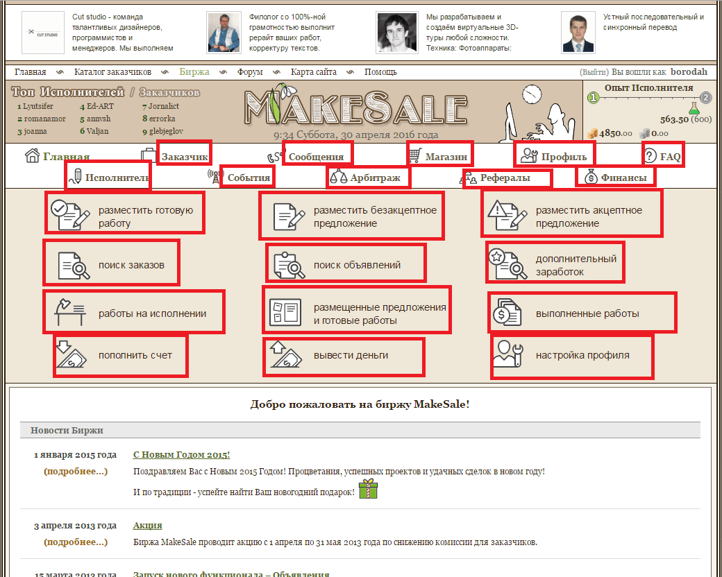 По поводу работы на биржи фриланса для начинающих MakeSale. Тут также у Вас не возникнет ни каких проблем. Вам после регистрации нужно просто посетить все вкладки, которые я отметил для Вас на скриншоте и визуально все самим посмотреть, что за что отвечает и что где находится. А также не забудьте заполнить свой профиль, чтобы другие пользователи биржи MakeSale смогли Вас видеть и найти.