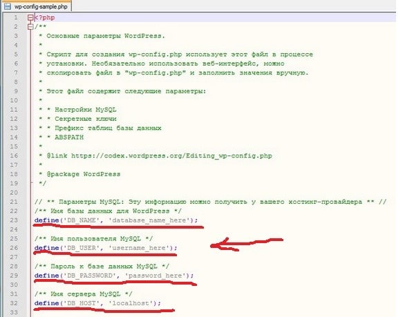 Нужно открыть переименованный вами файл wp-config.php, заранее скачав его себе на компьютер, в любом удобном для Вас текстовом редакторе, для меня это Notepad++ и немного подредактировать его. Написав там ваше имя базы данных в WordPress на вашем хостинге, ваше имя пользователя базы данных в WordPress, пароль базы данных в WordPress и имя сервера, вместо localhost пишите свое, у меня например mysql.mchost.ru и все.