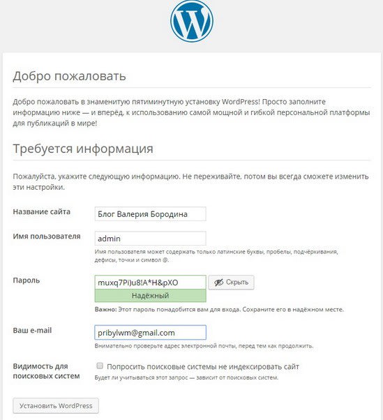 Жмете на кнопку “Установить WordPress”. Но если, что-то не понравиться, не беспокойтесь, потом можно будет изменить в консоли уже установленного блога WordPress.