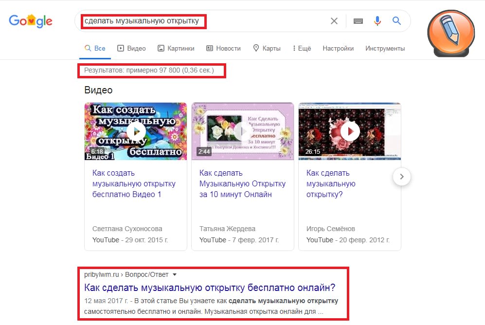 Например, если Вы выполните поиск в Google по «сделать музыкальную открытку», Вы найдете меня на странице 1. Если Вы забьете в Google «музыкальная открытка», меня нет на странице 1, хотя мой сайт полностью индексируется Google. Иногда Google помещает Вас на страницу 1 для определенного поискового запроса, иногда это не так.
