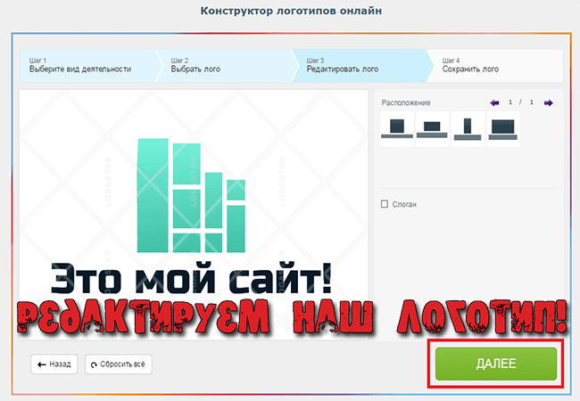 - Шаг третий – Здесь можно редактировать ваш исходный логотип. Выберите свой лозунг, цвет, расположение лого и так далее. Затем нажмите на кнопку “Далее”.
