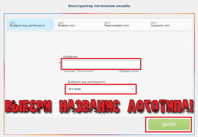 - Шаг первый – В поле “Название” указываем имя нашего логотипа, компании или сайта, на ваше усмотрение. Выбираем вид из выпадающего списка и жмем “Далее”.